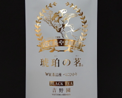 1998年に登場した元祖さやま紅茶・琥珀の茗明治時代に日本の紅茶を輸出していた頃に使われた「蘭字」をイメージしたラベル。中にはべにひかりのリーフが入っています。